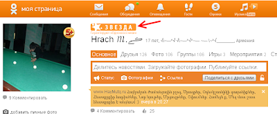 Բոլոր այն մարդիք ովքեր օգտվել են կամ օգտվում են одноклассники.ру կայքից ապա նկատած կլինեն, որ կայքում կան այնպիսի էջեր, որոնք պատկանում են հայտնի մարդկանց(աստղերի) և տվյալ մարդկանց էջի վերևում առկա է նման գրվածք Բոլոր աստղերի ցուցակը կարող եք տեսնել այստեղ:Եթե ցանկանում եք, որ Ձեր էջում նույնպես նույն գրվածքը լինի, ապա կատարեք իմ կողմից ցուցադրված քայլերը: Տեղեկացում: Այս ամենը կատարելով, աստղը կտեսնեք միայն Դուք, և էջը թարմացնելուց հետո կրկին այն կվերադառնա նույն տեսքին:- Մտնում եք Ձեր одноклассники կայքի էջը:
