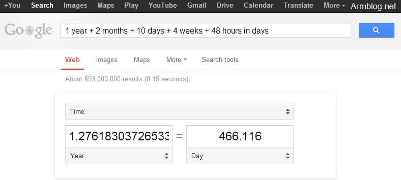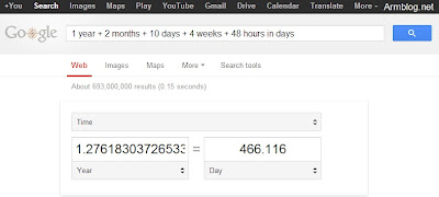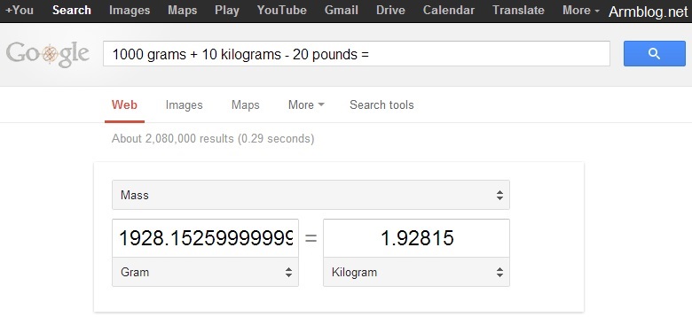 Երևի տեղյակ եք, որ Google որոնողական համակարգն իր մեջ ներառում է նաև հաշվիչ և արժեքների փոխարկիչ: Օրինակ25*68 որոնման միջոցով կարող ենք գտնել բազմապատկման արժեքը, իսկ 100 kg in grams որոնման միջոցով կարող ենք իմանալ, թե քանի գրամ է 100 կիլոգրամը: Սակայն Google-ը սրանով չի սահմանափակվում և ունի նաև տարբեր չափման միավորներ ունեցող արժեքների գումարը հաշվելու հնարավորություն: Այսինքն կարող եք արտահայտության մեջ խառնել տարբեր միավորներ և ստանալ այլ չափման միավորով արդյունք: Օրինակները տեսեք լուսանկարներում՝