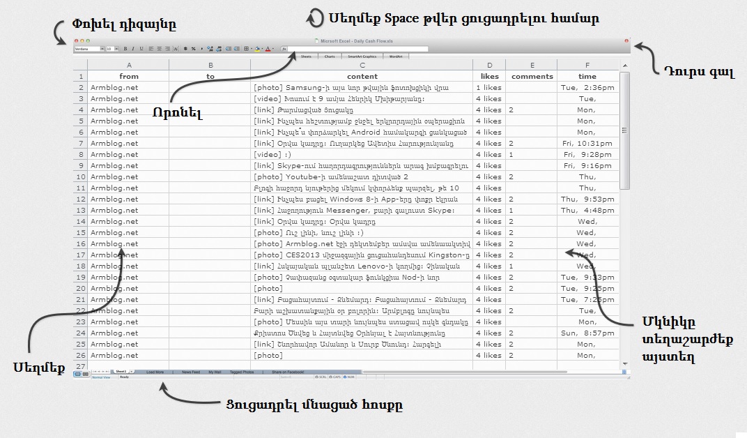 | Գլխավոր էջ » 2013 » Հունվար » 15 » Ինչպես Ֆեյսբուքի հոսքը դարձնել Excel-ի փաստաթուղթ և օգտվել աշխատանքի վայրում
