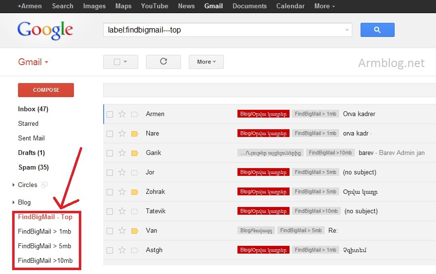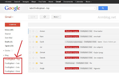 7. Այցելեք Gmail և կտեսնեք նոր ստեղծված բաժիններ (label), որոնցում դասավորված են համապատասխան ծավալի ֆայլերը: Օրինակ 10 Mb-ից մեծ նամակների բաժնի անվանումը FindBignMail>10Mb է: