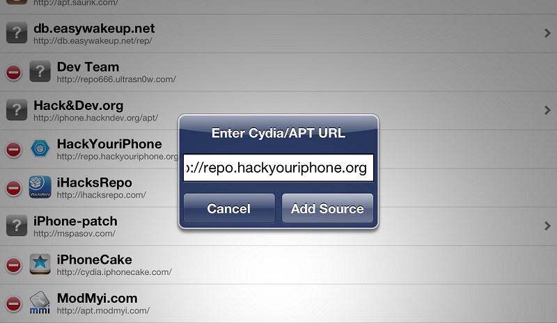 3. Բացեք Cydia ծրագիրը: Մտեք Sources բաժինը: Սեղմեք Edit, հետո Add: Գրեք http://repo.hackyouriphone.org ու սեղնեք Add Source: