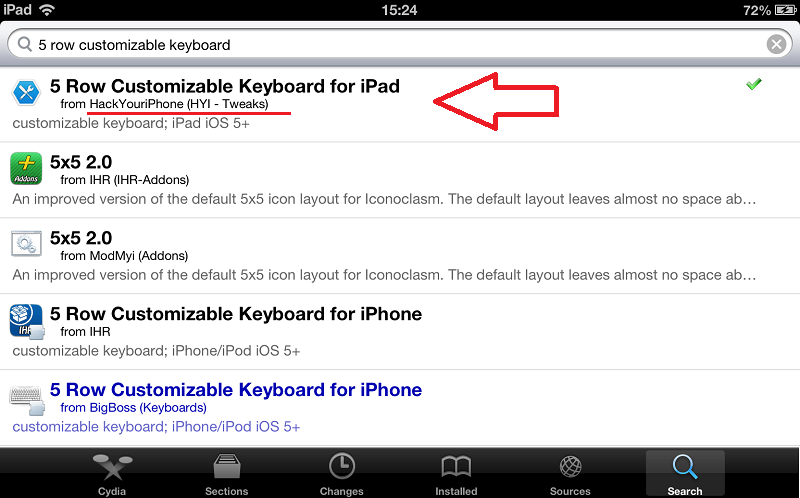 4. Բացեք Cydia ծրագրի Search բաժինը ու փնտրեք 5 Row Customizable Keyboard: Սեղմեք այդ ծրագրի վրա և բացված էջում սեղմեք Install: